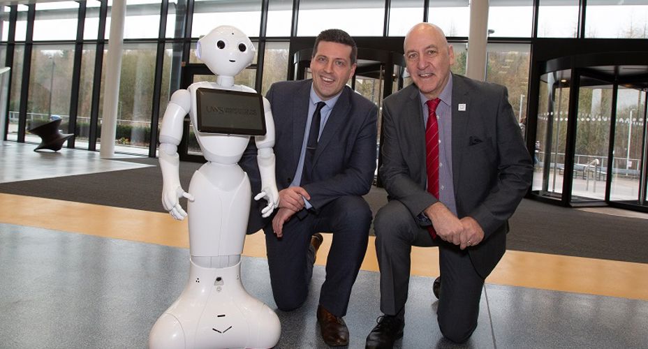 Ready to greet Jamie Hepburn on arrival was Pepper the Robot, a semi-humanoid robot, used by the University to teach programming to students as well as providing opportunities to conduct research into human-robot interactions.