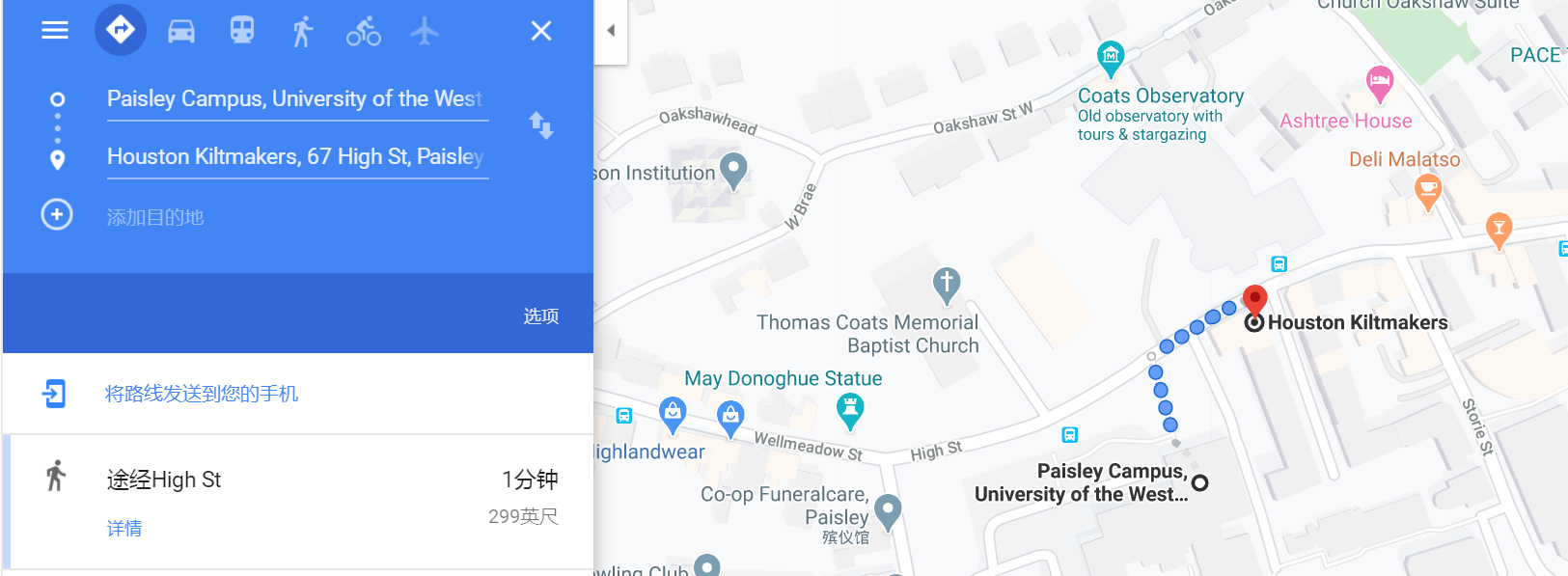 如果小伙伴们感兴趣,而又恰好在UWS的佩斯利校区的话,那么,不要犹豫,赶紧安排起来吧!因为在距离它大约90米(步行只需要一分钟)的地方,就有一家售卖Kilt的商店哦!